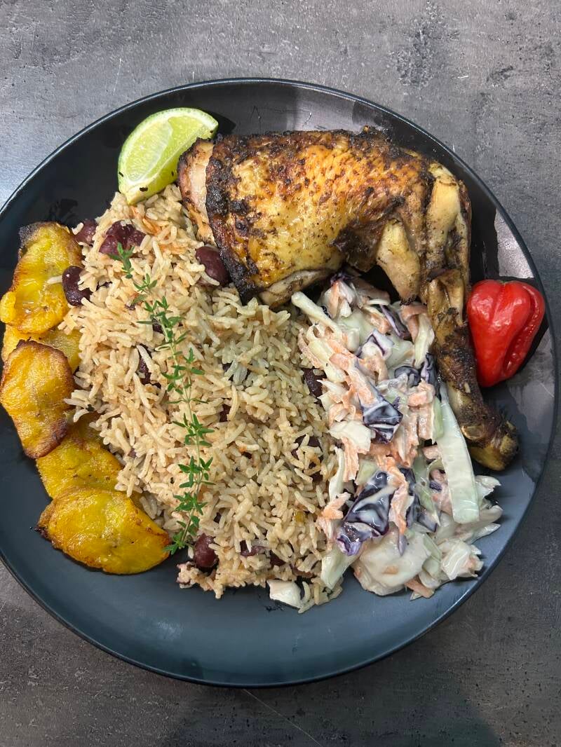 This dish is iconic to Jamaica. A succulent chicken which is grilled or baked and has been marinated for 24 hours in a rich jerk sauce. This sauce is spicy and to acheive the unique flavour it has been infused with spices, peppers and herbs to give it this classic authentic taste to Jamacia. The chicken is cooked on the bone and served with rice and red kidney beans cooked in coconut milk. A side dish of fried plantain, and chunky homemade coleslaw.